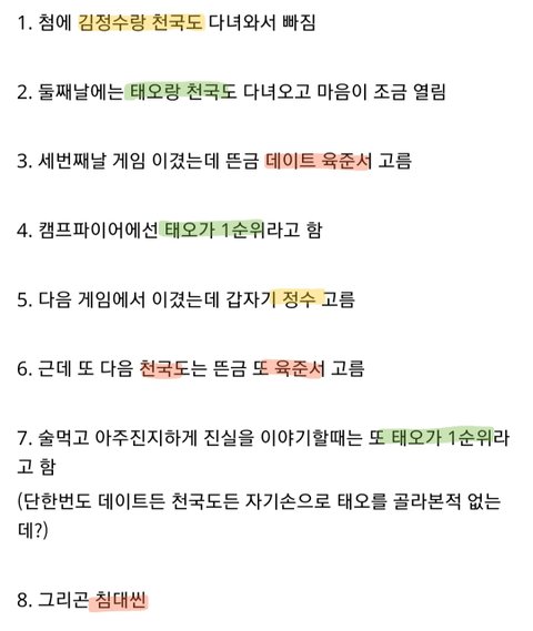 육준서는 말투가 안좋지 정수는 어장치지 태오가 제일 정상적으로 본인만 바라보고 좋아해줘서 ㄹㅇ 머리로는 태오라고 생각하는데 자기가 좋아하는 스타일은 아닌가봄 나쁜남자 좋아하나봐 근데 본인이 태오가 1순위이고 설레볼려고 노력했으면 태오 한번이라도 선택해줘야 했어 아 태오 보는데 마음아픔 애가 성격이 좋아서 좀 겉도는 유진이랑도 대화 많이 해주고 그러던데 태오가 뭐가 부족해 잘생겼지 키크지 경희대 경영 출신이지 성격좋지 완벽한데ㅠㅠ