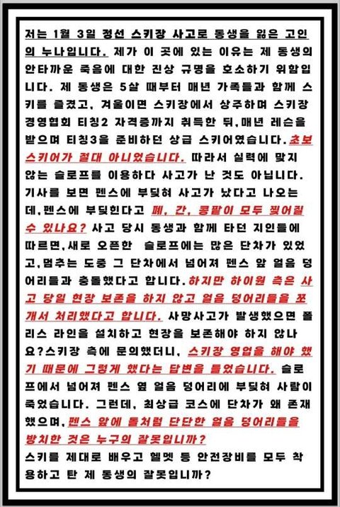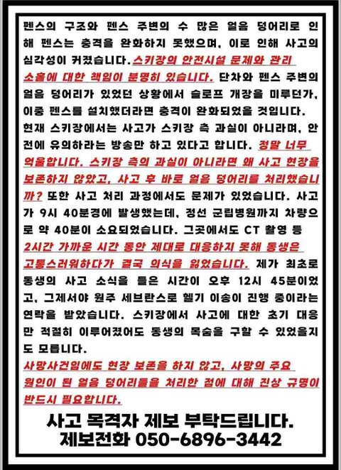 영업을 해야해서 얼음을 쪼개서 없앴다. 이 말 자체가 과실인정 아닌가요? 원래 영업을 해야하면 얼음이 없어야한다는 말이니까요. 근데 없어야 할 얼음때문에 사고가 났잖아요. 과실은 있지만 책임은 없다는 건지 자기들이 무슨얘길 하고있는건지 자각조차 없고 삼가 고인의 명복을 빕니다.