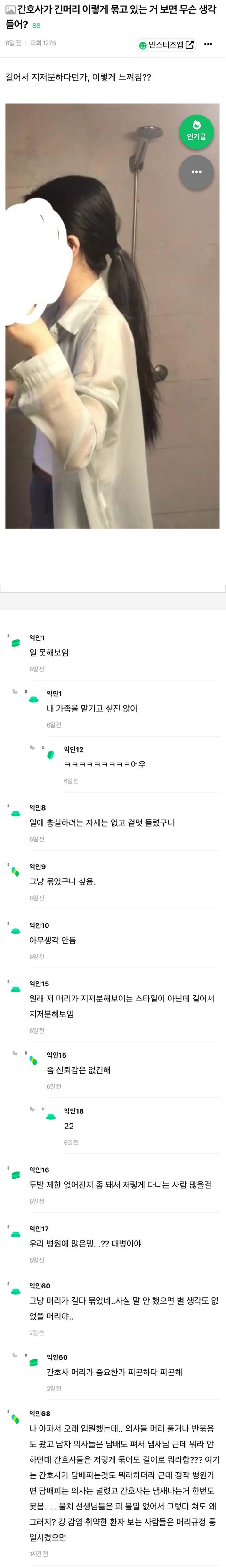 사람들 간호사한테만 엄격함. 의사 긴머리 풀고, 방사선사 반묶음해도 관심 없는데 간호사들한테만 그러는듯ㅋㅋ 근데 이게 웃긴게 간호사 지들끼리도 머리가 긴데 안묶었다는등 지들끼리 못잡아먹어서 안달임(현직인건 안비밀)