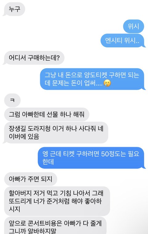 위시콘 양도받아서 가고싶었는데 최근에 다리 다쳐서 알바 못구할거같아서 아빠한테 한번 말해봤더니 그냥 양도비 다 주신대 ㄹㅈㄷ 할아버지한테 줄 도라지청 5만원도 안하는데 위시콘 양도비 50만원을 그냥 주신다고 함