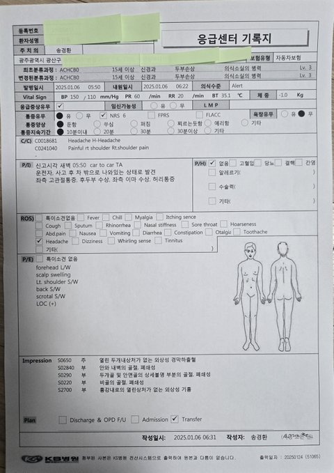 불구하고 교통사고에 의한 경막하출혈(뇌출혈)환자를