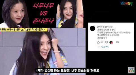 당시 과장된 표정 묘사로 경쟁 팀 센터 장원영과의 비교로 힘든 시간을 보냈던 김초연은 "나를 아직도 그 영상으로 기억하시더라. 지금도 내 글에 '그 사람 아님?'이라는 댓글이 달린다"라고 말했다.