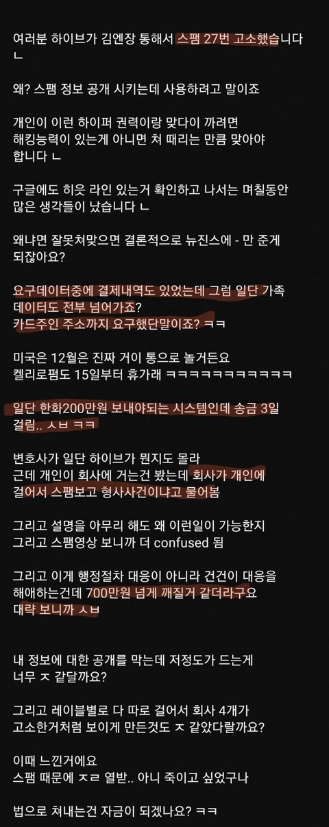 뉴진스팸이라고 르세라핌, 아일릿 주로 욕하던 악질 채널이었는데 하이브가 얘 신상 얻으려고 27번 고소했대