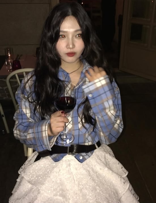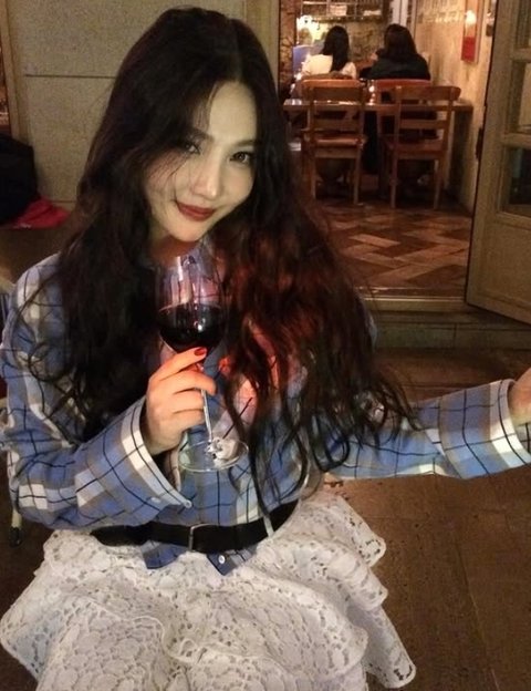 조이 소셜 미디어사진 속 조이는 와인잔을 손에 들고 카메라를 향해 미소 짓고 있다. 웨이브 헤어스타일이 성숙미를 돋보이게 한다.
