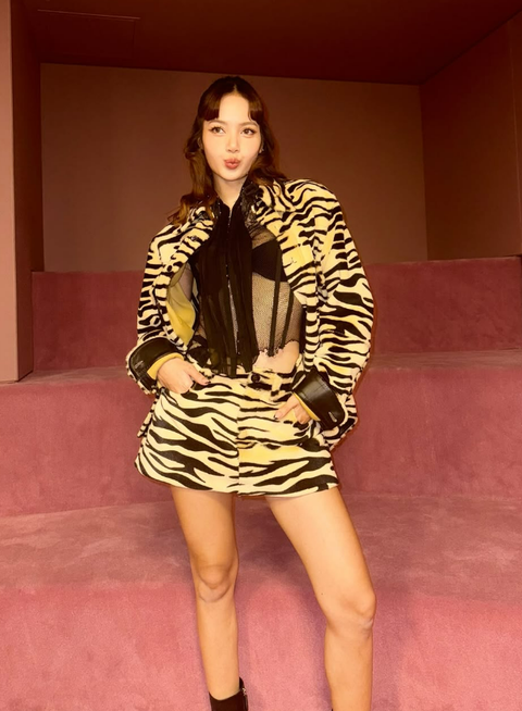 사진 속 리사는 호랑이 무늬가 그려진 재킷과 치마를 입고 카메라 앞에서 포즈를 취하고 있다. 리사는 두 손을 치마 주머니에 넣고 새침한 표정을 짓고 있다.