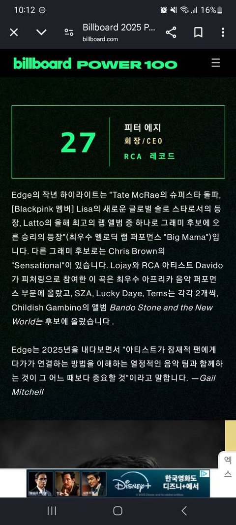빌보드 선정 음악관련 기업 9위 rca ceo 작년 성과