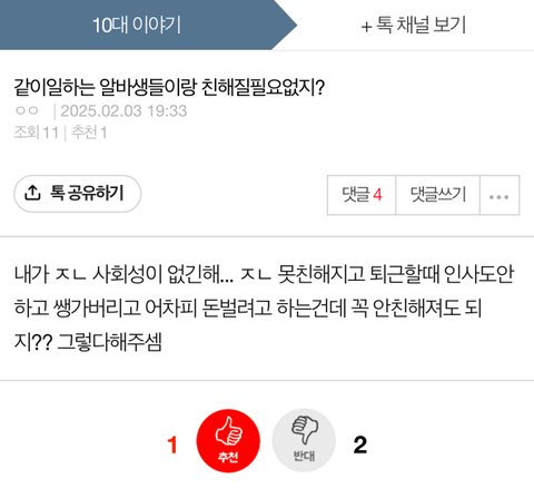 이런애는 도대체 뭐가 문제임? 차피 니 ㅈ대로 할거같은데 물어보긴 왜물어봄? 아오 진짜 내가 저런것들이랑 대화하고 있었다니 ㅈㄴ소름끼치네 사회성ㅅㅂㅋㅋ 진짜 친구없지?