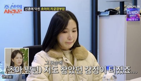 TV조선 ‘조선의 사랑꾼’ 캡처초아는 "화장실에서 꺼이꺼이 울었다. 그때 남편도 와서 같이 부둥켜안고 울었던 것 같다"며 눈물을 흘렸다.