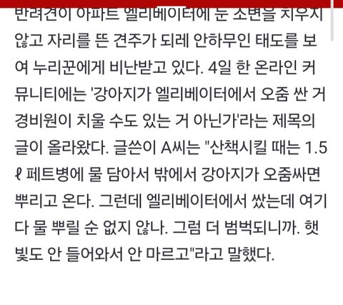 애가 엘레베이터에 오줌쌌는데 애엄마가 저랬다고 하면 미친듯이 깔걸? 개도 자식이라며ㅋ 지 자식 오줌싼 거를 왜 경비아저씨더러 치우래