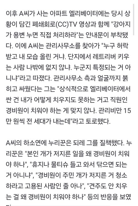 "승강기 강아지 오줌 경비원이 치우면 안되나"…견주 글 입길