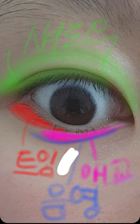 연두색 부분에 섀도우하고, 파란색 부분에 애굣살 음영 넣고, 핑크색 부분에 애굣살부분 하양이나 핑크 + 펄 넣고주고, 빨간색 부분에 트임? 해주면 되는거지?? 눈화장은 몇 번 안해봐서 ㅜㅜ