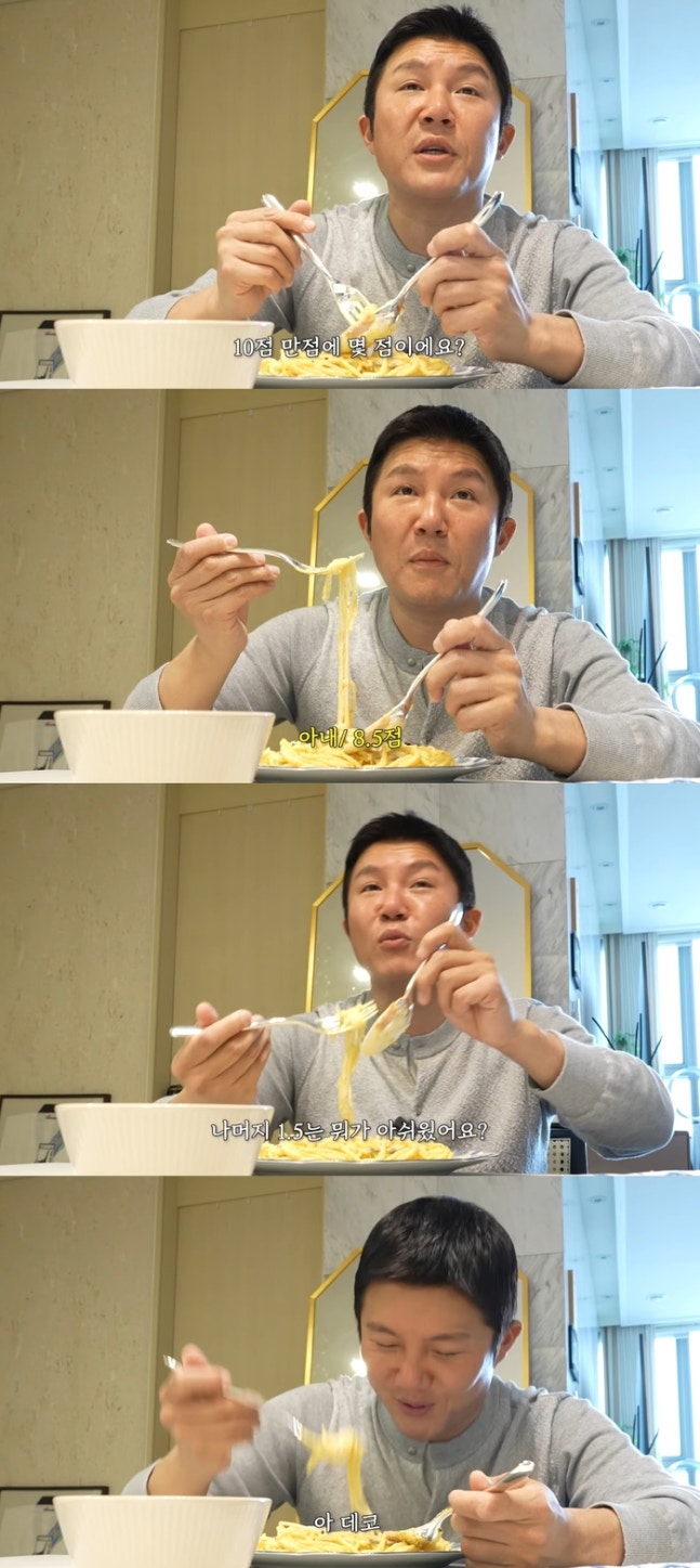 조세호 유튜브 캡처.조세호가 아내에게 “까르보나라가 10점 만점에 몇 점이냐” 묻자 아내는 “8.5점”이라 답했다. 아쉬운 점에 대해 묻자 잠시 고민하더니 “데코?”라고 말하며 “그래도 맛은 진짜 너무 좋았다”라고 칭찬하며 훈훈함을 자아냈다.