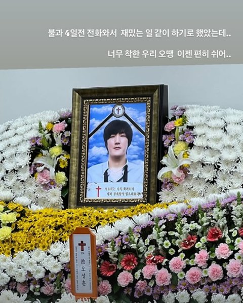 배우 강수정은 고 오성훈의 영정사진을 공개하기도 했다. 그는 "불과 4일 전 전화 와서 재밌는 일 같이 하기로 했었는데… 너무 착한 우리 오땡 이젠 편히 쉬어"라고 했다.