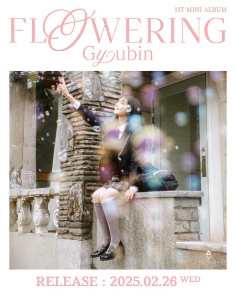 공개된 커밍순 포스터에는 규빈이 난간에 앉아 거리에 흩날리는 비눗방울을 향해 손을 뻗으며 환하게 웃고 있는 모습과 함께 2025년 2월 26일 첫 미니앨범 ‘Flowering’을 공개한다는 문구가 담겨 있어 글로벌 팬들의 기대감을 증폭시키고 있다.
