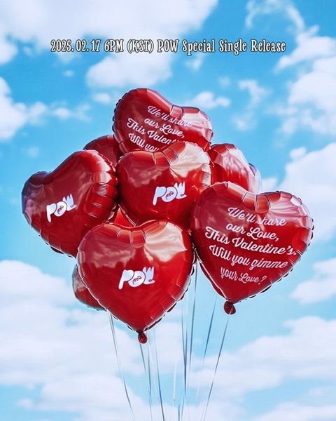 구름이 예쁘게 수놓인 청량한 하늘을 배경으로 그룹명 ‘POW’와 ‘We’ll share our Love, This Valentine‘s. Will you gimme your Love?’라는 메시지가 담긴 붉은색 풍선이 시선을 사로잡는다. 강렬한 레드와 하늘색이 대비를 이루며 달콤하면서도 임팩트 있는 ‘파우(POW)표 음악’에 대한 기대를 고조시켰다.