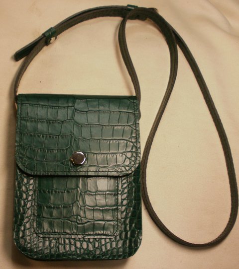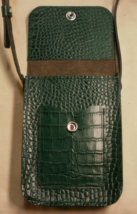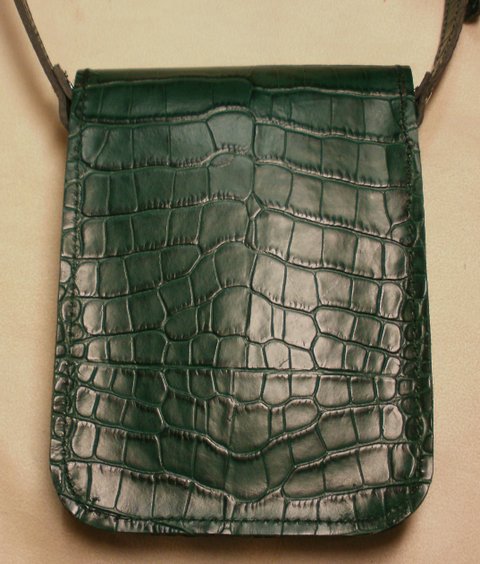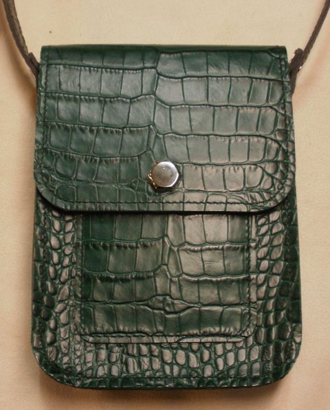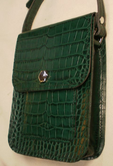 다크 그린 컬러 악어 무늬 엠보싱 천연 가죽으로 제작한 휴대폰 수납용 미니 숄더 백입니다.(마디샤)