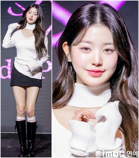 이날 아이브(IVE 안유진, 가을, 레이, 장원영, 리즈, 이서) 멤버들은 전체적으로 화이트&블랙의 화보 분위기 가득한 패션을 뽐냈다. 특히 장원영은 달 토끼 처럼 귀여운 상의에 블랙 스커트. 여기에 롱부츠로 코디했다. 또 미니멀 액세서리와 함께 장원영의 토끼 같은 미모가 더욱 빛났다. 최근 남다른 피지컬로 화제를 모으고 있는 장원영은 윙크와 함께 아이돌 플러팅도 잊지 않았다.