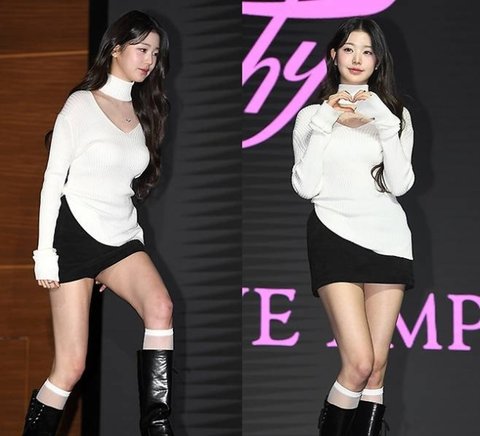 장원영은 화이트 오프숄더 니트와 블랙 미니스커트를 매치해 ‘하이틴 무드’를 완벽히 살렸다.사진=천정환 기자