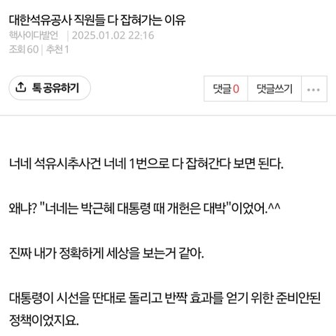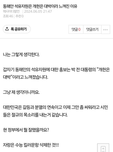 저는 2024년 6,7월에 이미 석유시추는 박근혜 대통령시절 개헌은 대박과 똑같고 국면전환용이라고 언급했습니다. 2025년 1월에 한번 더 언급 했습니다.