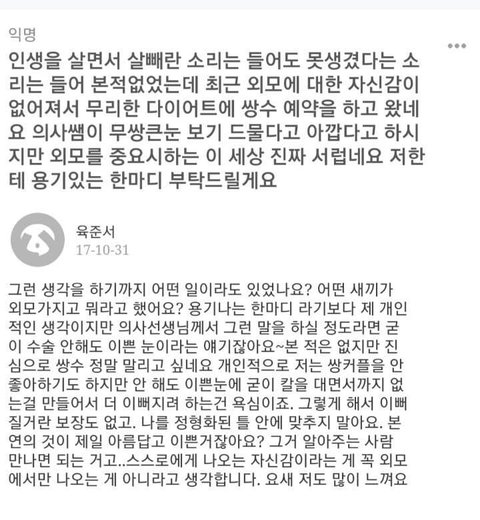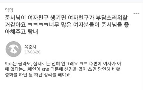 육준서 솔지에서 별로인거 알겠는데 외모로 조롱하는글 너무 많이 올라와서 좀 그럼… 중안부는 뭐 자기가 스스로 줄일수있는것도아니고 그렇게 태어난건데 뭐 어떡함