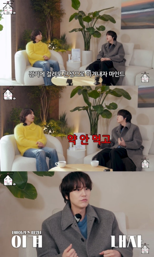 규현은 “감기에 걸려도 근성으로 이겨내자 마인드다. 약 안 먹고”라며 코로나 확진 때 열이 41도까지 올라가도 약을 안 먹고 버텼던 때를 떠올렸다.