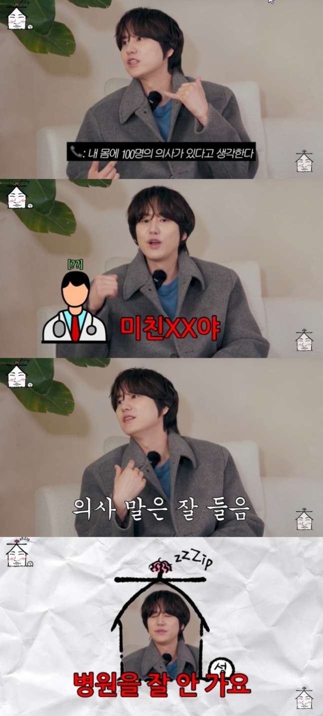 규현은 “‘이겨내자. 난 열에 지고 싶지 않다’라고 하루를 그냥 버텼다. 주위 지인들이 ‘야 그건 아닌데’라고 해서 의사 형한테 전화했다”라며 “‘나 지금 열이 41도인데 내 몸에 100명의 의사가 있다고 생각한다. 나 이겨내고 있는 거 맞죠?’라고 했더니 의사 형이 ‘미친 XX야. 그건 건강할 때 의사가 100명 있는 거고, 열이 41도면 의사들 다 죽었다. 약부터 먹어라’고 하더라. 그럼 그때 약을 먹는다. 의사 말은 잘 듣는 편이다. 웬만하면 약을 안 먹고 이겨내는 스타일이다. 병원을 잘 안 간다”라고 설명했다.