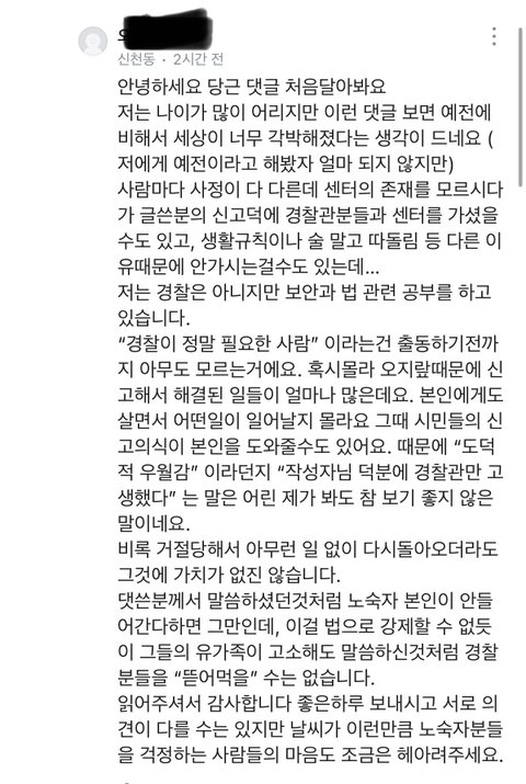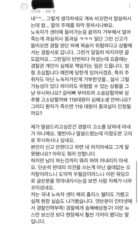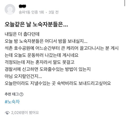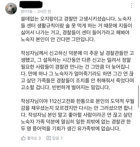 추가))) 내가 학생말이 맞는거같다고 한건 노숙자를 무조건 도와줘야한다는게 아니라 완전히 익명도 아닌 동네생활글에 글쓴 사람을 (불우이웃, 봉사 등 동네에서 활동 많이 하는 분이었음) 을 도덕적 우월감,쓸데없는 오지랖이라는 말을 써가면서까지 글쓴사람을 깎아내릴만 한 일인가? 때문이였어