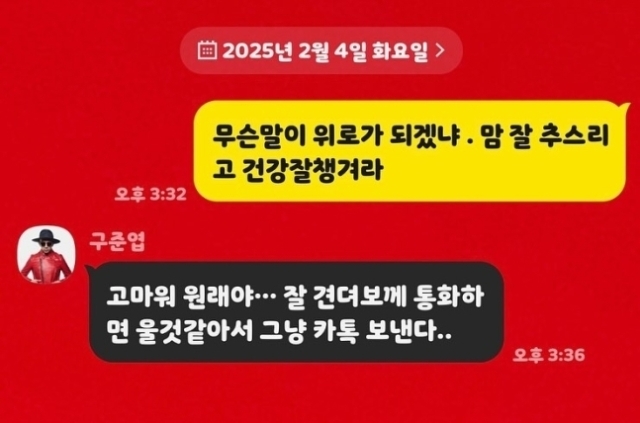 공개된 메시지에서 강원래는 구준엽에게 “무슨 말이 위로가 되겠냐. 마음 잘 추스르고 건강 잘 챙겨라”라고 응원의 말을 전했다. 이에 구준엽은 “고마워 원래야.. 잘 견뎌볼게. 통화하면 울 것 같아서 그냥 카톡 보낸다”라고 답하며 애써 감정을 추스르는 모습을 보였다.