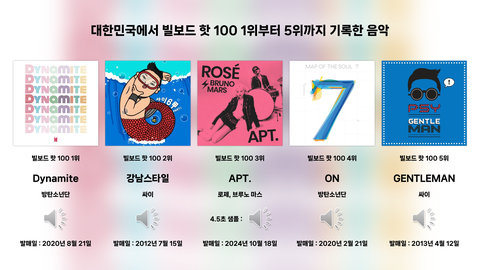 대한민국 빌보드 핫100 1위부터 5위까지 기록한 음악