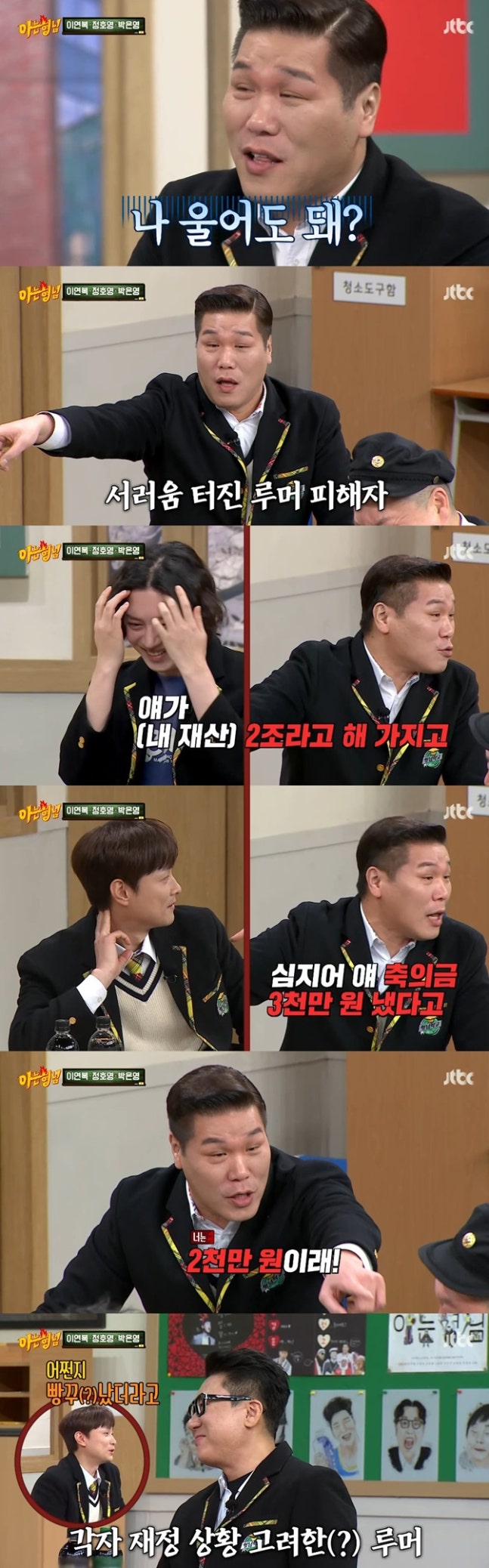 정호영의 우동집에서 회 서비스를 요구했다는 일화로 자신을 놀리는 김희철에 "아오"라며 분노한 서장훈은 "얘 때문에 정상적인 생활이 불가능한다. 나 울어도 되냐. 얘가 내 재산이 2조라고 했다"고 울분을 토했다.