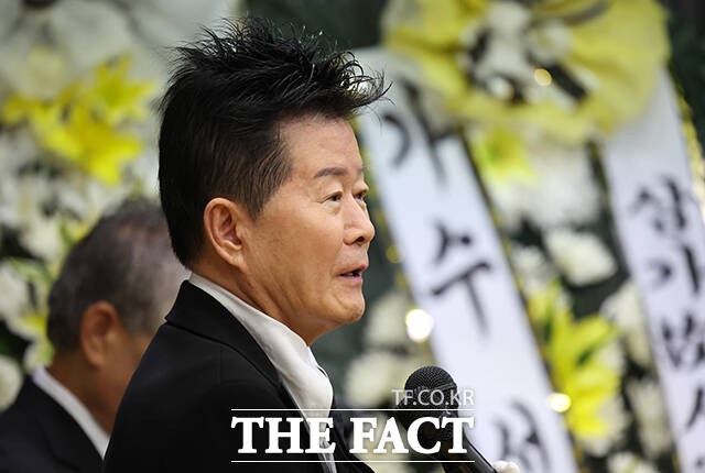 트로트 가수 태진아가 9일 오전 서울 종로구 서울대학교병원 장례식장에서 진행된 故 송대관 영결식에 참석해 "잘 가, 영원한 나의 라이벌"이라고 인사했다. /서예원 기자태진아는 덤덤한 목소리로 추도사를 읊었다. 그는 "무슨 말을 할까 생각이 많았다. 저는 형님이 부럽기도 하고 자랑스럽기도 했다. 형님은 저에게 멘토였다"고 떠올렸다.