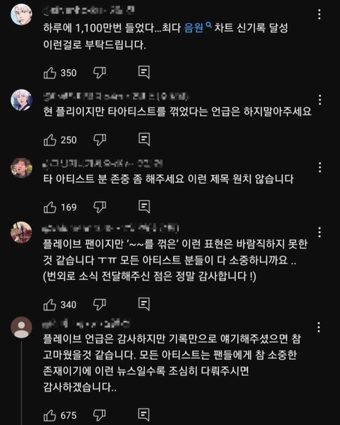 플리들 반응은 축하보다 "타 아티 존중해달라", "타 아티 언급 빼달라", "이럴거면 뉴스 내려달라" 위주였고, 지금도 인기순 댓글 대다수가 이런 내용임