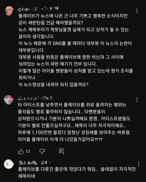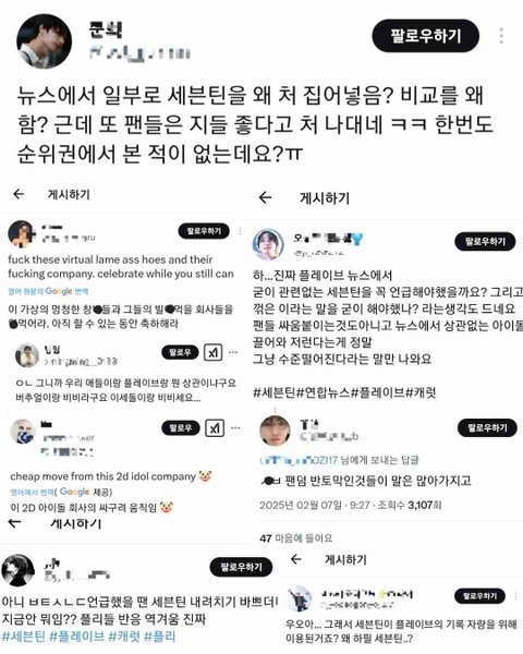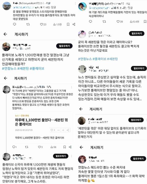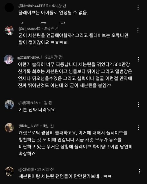 참고로 세븐틴이 볼까봐 속상하다는 캐럿은 플레이브 공계에 난리쳐서 컴백 직전에 표절 의혹 뉴스까지 나게 한 전적이 있음