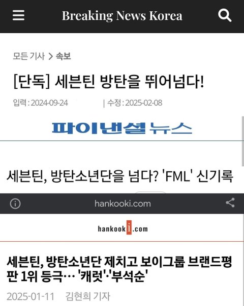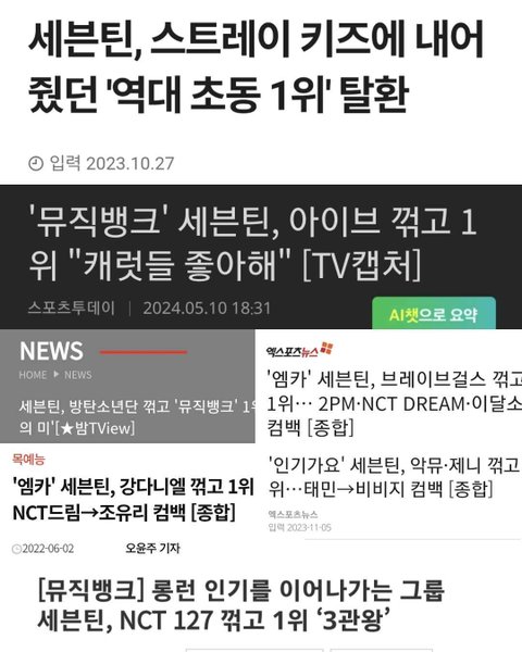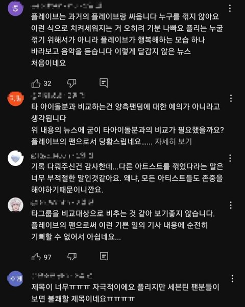 근데 세븐틴도 타 아티 언급하고, 꺾은, 제치고, 뛰어넘은, 탈환 이런 단어 쓴 뉴스들이 있음. 결국 뉴스는 언론사 문제인데 캐럿은 플레이브 잡는중