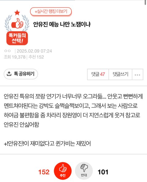 지금까지 나온 예능들 반응 다 좋고 ㅂㄹ라고 하는 사람 없던데 추천이 2만조회수에 200개ㅜ? 조작도 좀 티 안 나게 할 순 없나