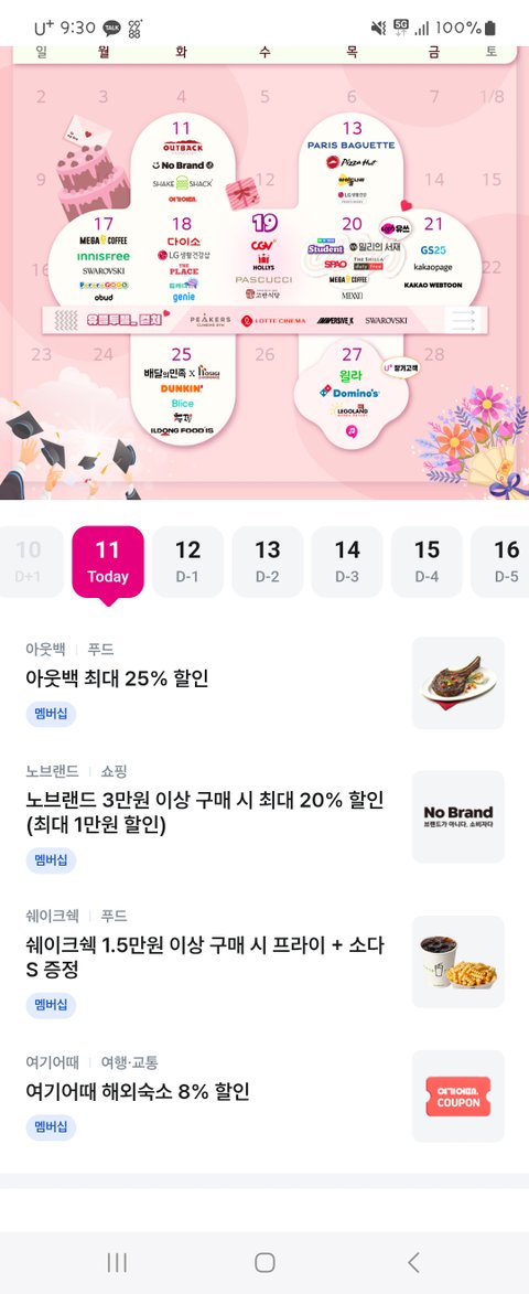 오늘 아웃백 받고 목요일에 파바 할인쿠폰 받아야겠어요
