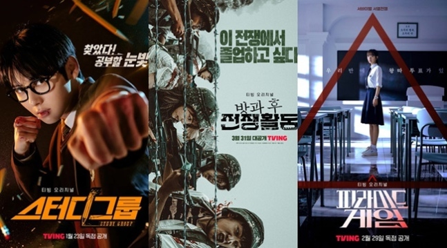왼쪽부터 티빙 ‘스터디그룹’, ‘방과 후 전쟁활동’, ‘피라미드 게임’신인을 적극 기용한 티빙표 학원물은 '스터디그룹'이 처음은 아니다.