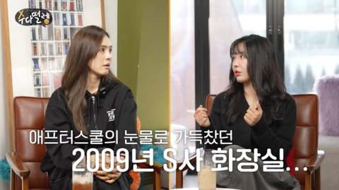 레이나는 이어 "'너 때문에'라는 노래가 슬프지 않나. 회사에서는 감정 잡으라고 대기실에서 스태프랑 말도 못 하게 했다"고 폭로했다. 가희 역시 "연습실에 한 명씩 거울 앞에 앉혀놓고 누가 빨리 우나 대결도 했다. 슬픈 노래 틀고 눈물 흘리는 감정 연습을 그렇게 했다. 주연이가 제일 빨리 울었다"고 이야기했다.