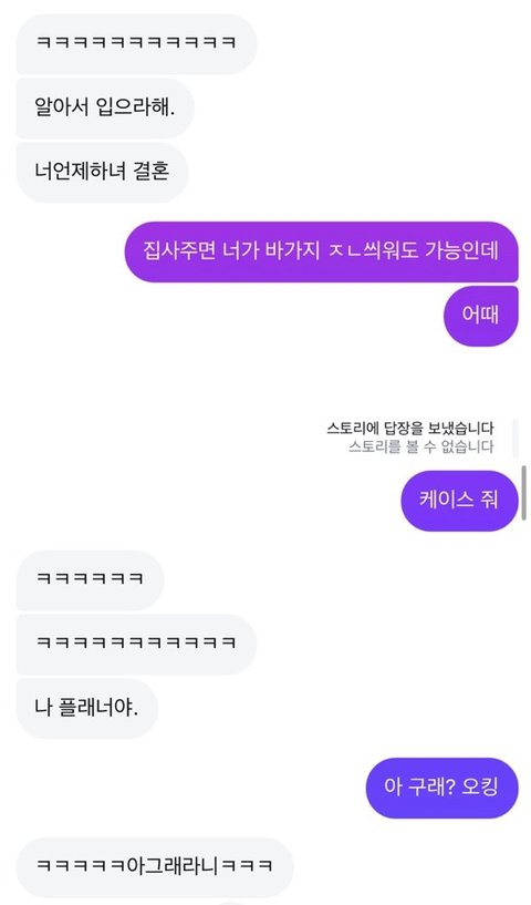 여사친과 나눈 대화의 시작은 여사친이 웨딩드레스를 입은 스토리를 올려서 남친이 너결혼하냐고 물어보면서 시작 됬네요.