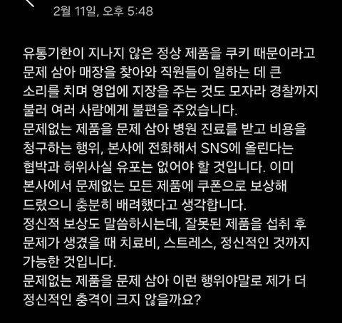 투*플레이스 본사와 연락하였고, 협박 받은 상황, 응급실 다녀온 점 등 알렸습니다.그러나 역시 2일 남은 쿠키는 유통기간에 문제없다라며 잘라 응대하더라구요. 계속해서 법적 문제 없다.저는 소리치고 협박과 억지소리하는 (용*산역점-투*플레이스) 점주와는 통화 못하니 중간에서 도와달라하니 투*플레이스 본사는 쿠폰 발급까지만 가능하고 병원비(저는 관련 내용 전달만 요청/비용대신 지불 요청 아님-단순 내용 전달 간절히 요청)는 직접 당사자들끼리 해결하라며 거부하며 유통기간에 법적문제 없는 제품이다 라는 말만했습니다. 개인이하는 쿠키샾에서 구매한것이 아닌 투*플레이스라는 브랜드를 믿고 샀는데도 말이죠.