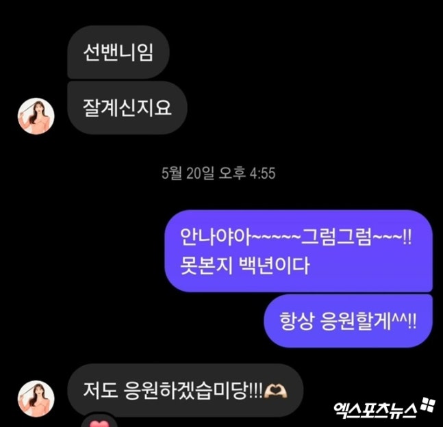 故오요안나는 '선배님 잘 계신지요'라고 장성규에게 밝게 안부를 물었고, 장성규 또한 '안나야~ 그럼그럼!! 못본지 백년이다', '항상 응원할게^^!!'라고 답해 눈길을 끈다.