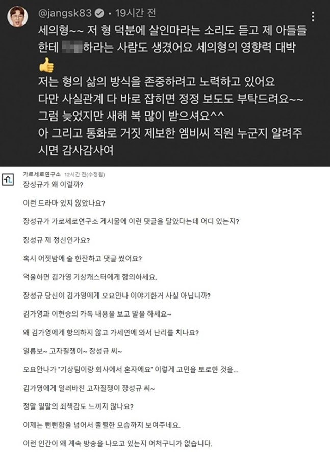 이에 대해 장성규는 지난 8일 '가세연' 채널에 직접 "형 덕분에 살인마라는 소리도 듣고 제 아들들한테 XX하라는 사람도 생겼다", "사실관계 다 바로 잡히면 정정 보도도 부탁한다", "통화로 거짓 제보한 MBC 직원 누군지 알려주시면 감사하겠다"는 댓글을 남기며 반박했다.