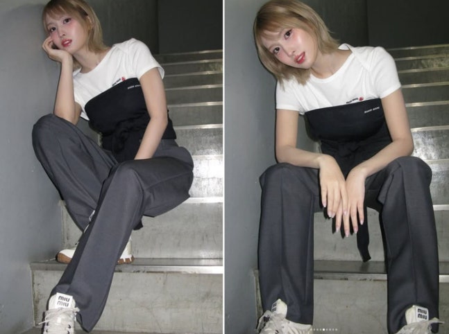 사진 속 모모는 흰색과 검은색이 배색된 상의에 회색 바지를 입고, 캐주얼한 스타일을 선보였다. 특히, 금발 헤어스타일과 뽀얀 피부가 그의 인형 같은 미모를 더욱 돋보이게 한다.