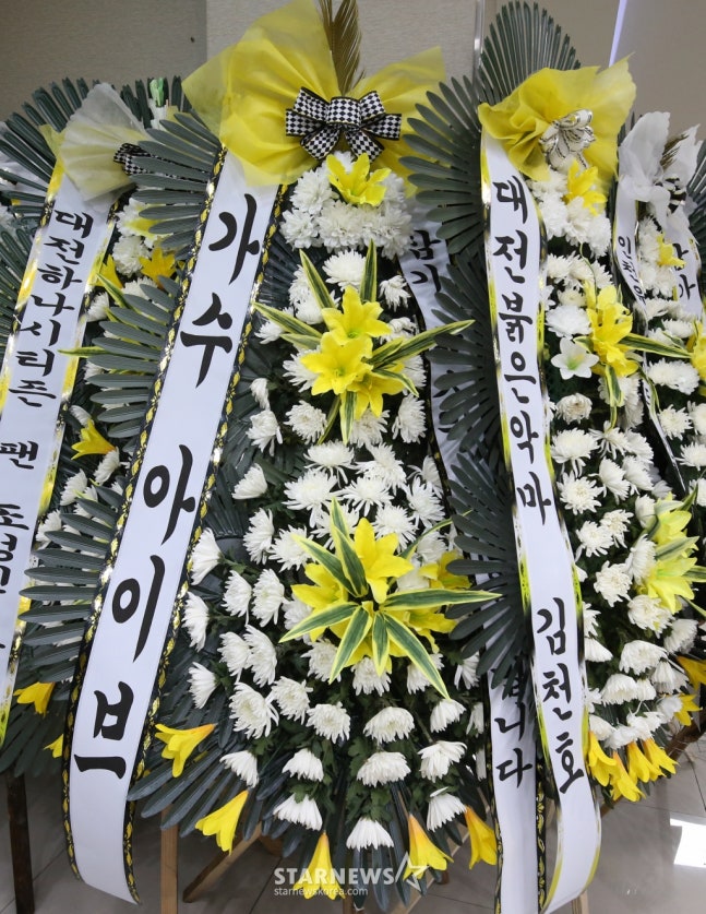 지난 11일 건양대학교 장례식장에 고 김하늘 양의 빈소가 마련됐다. 빈소에는 '가수 아이브', '삼가 고인의 명복을 빕니다'라고 적힌 근조화환과 아이브의 포토카드가 놓였다.