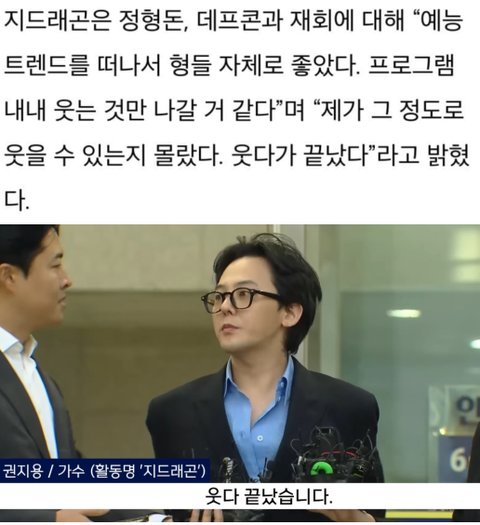 "오랜 시간이 지났지만 (데프콘과 정형돈 사이에서) 전 혀 공백이 느껴지지 않았다. 개인적으로 형들 자체가 좋 았다"고 소감을 전했다. 이어 "(방송 내내) 웃는 것만 나 갈 것"이라며 그정도로 웃을 수 있을지 몰랐다. 웃다가 끝났다"고 덧붙였다.