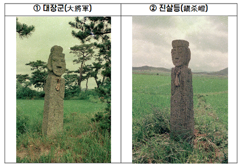 [크기] ① 대장군(大將軍) : 높이 200cm, 두께 31cm ② 진살등(鎭杀嶝) : 높이 210cm, 두께 30cm특징 : 목에 새끼줄로 엮은 소의 턱뼈가 걸려 있음