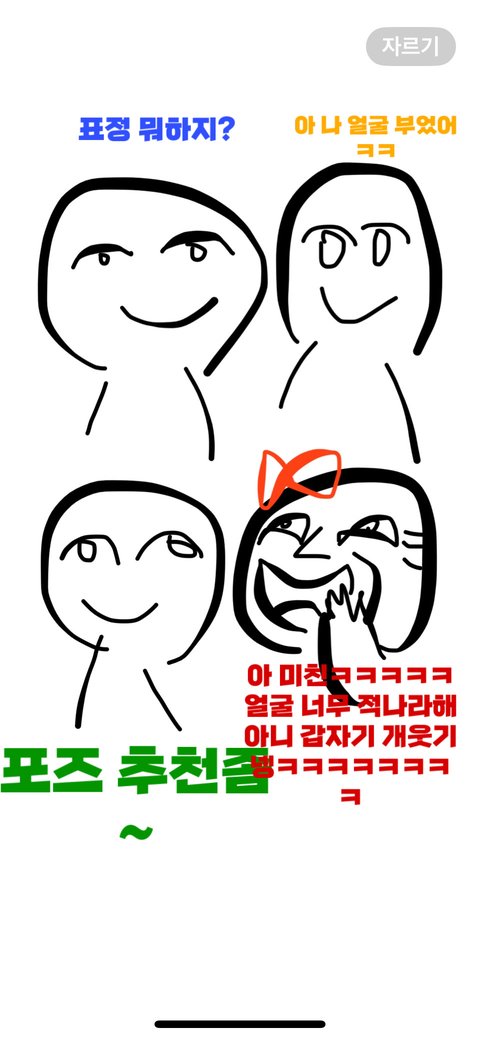 아 그리고 혼자 머리 엄청 뒤로 빼는 애들 있음 짜증 당연히 자연스레 위치 바뀔 수 있는건데 무조건 항상 조금이라도 머리 작게 나오려고 그러는 애들 있어