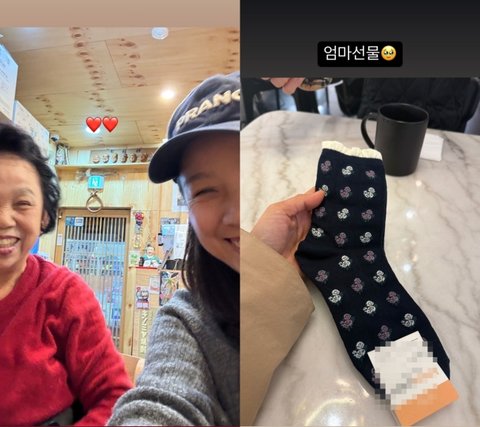 공개된 사진 속에는 이효리가 모친과 만나 식당에서 찍은 셀카와 선물 받은 양말 한 켤레가 담겨 있다. 이효리와 모친의 똑닮은 눈웃음이 눈길을 사로잡는다.