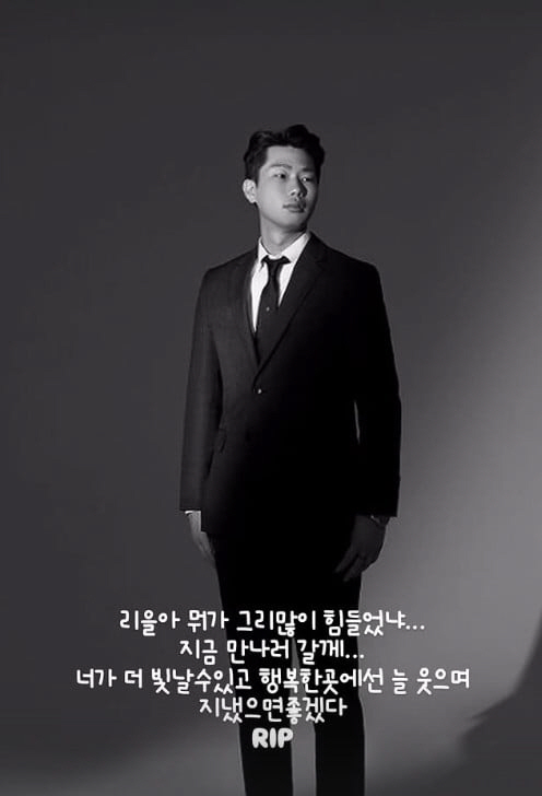 먼저 이홍기는 12일 자신의 계정에 "리을아 뭐가 그리 많이 힘들었냐... 지금 만나러 갈게... 너가 더 빛날 수 있고 행복한 곳에선 늘 웃으며 지냈으면 좋겠다. RIP"라는 글과 함께 고인의 사진을 올렸다.