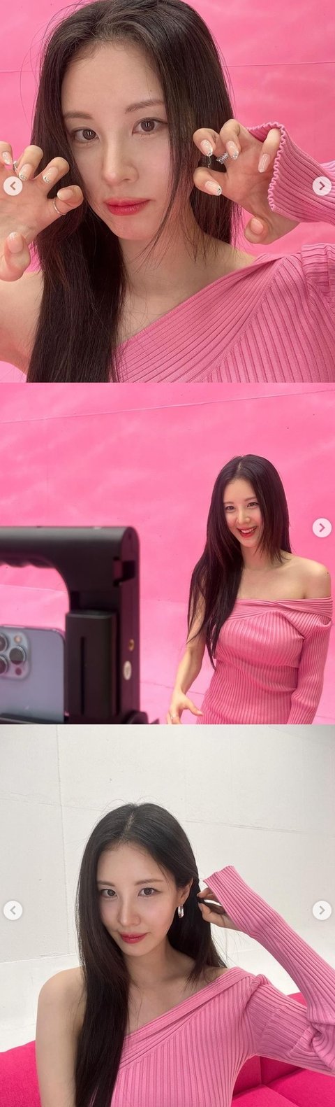사진 속 서현은 핑크색 오프숄더 원피스를 입고 여리여리한 몸매를 보여준다. 서현은 고양이 포즈를 취하며 러블리한 모습이다. 서현은 한층 성숙해진 비주얼과 세련된 분위기로 눈길을 사로잡는다.